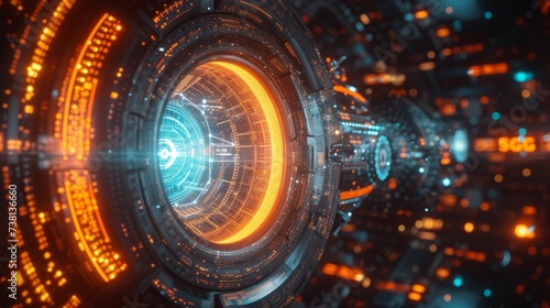 Futuristic spaceship engine glowing with blue and orange lights