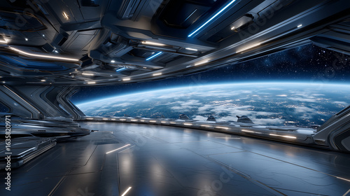Futuristic spaceship hangar with panoramic view of Earth from orbit, advanced starships parked inside, sleek metallic interior, cinematic lighting, ultra-realistic sci-fi concept s