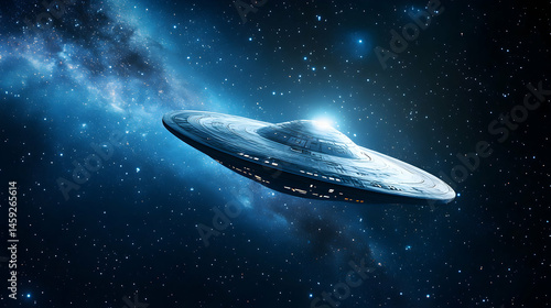 Futuristic spaceship in outer space with starry cosmic background