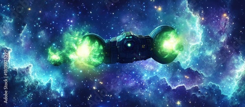Futuristic Spaceship Soaring Through Nebula, Glowing Green Engines, Cosmic Exploration, Digital Art.