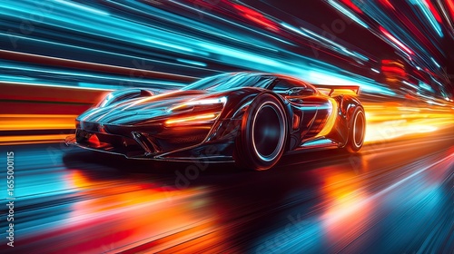 Futuristic Sports Car Drifting with Light Trails Effect, Motion and Speed Captured in Digital Art