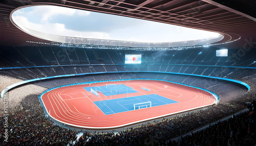 Futuristic stadium filled with spectators watching advanced sports and competitions