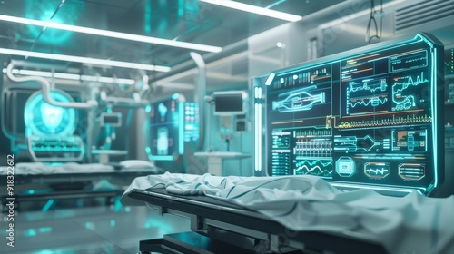 Futuristic surgical room with advanced technology and glowing displays during a medical procedure