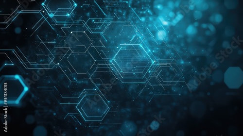 Futuristic tech background with hexagonal motifs, circuit lines, dark blues and greys, glowing teal highlights, innovation and style.