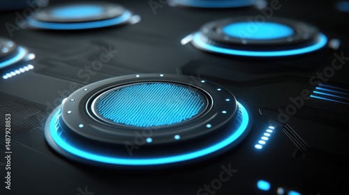 Futuristic tech interface with glowing blue circular elements displaying data patterns on a dark surface