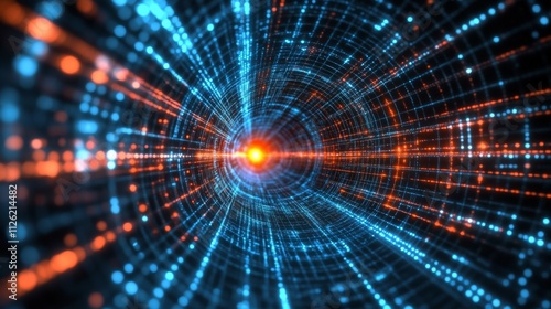 Futuristic Technological Landscape: Dark Blue Background Tunnel with Radiant Orange Light, Dynamic Energy and Movement.