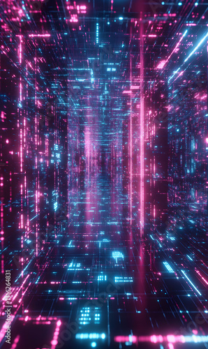 Futuristic technological landscape with digital neon illumination and geometric forms