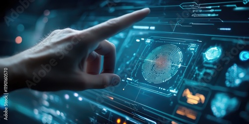 Futuristic Technology Interface with Hand Touching Digital Screen and Biometric Scanning Elements