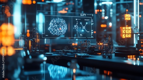 Futuristic technology lab with holographic displays showing network data and complex algorithms.