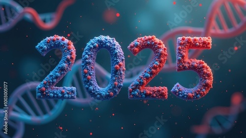Futuristic text of 2025 with a DNA spiral in blue and pink neon colors, symbolizing scientific progress