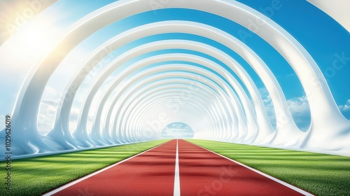 Futuristic track with white arches under a bright blue sky, emphasizing speed and athleticism.