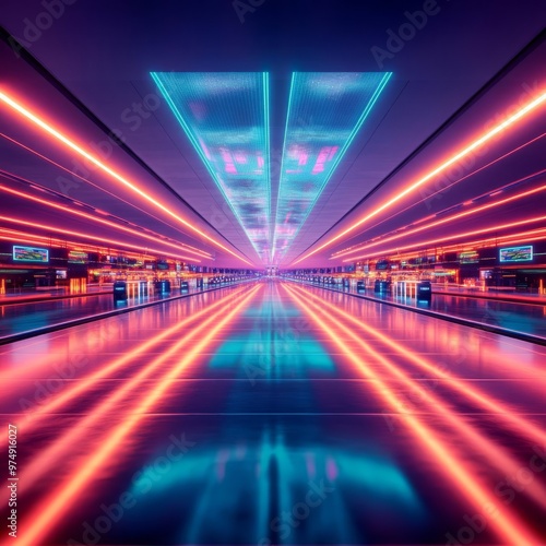 Futuristic transportation hub, holographic flight paths, neon-lit terminals
