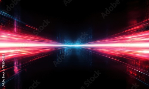 Futuristic tunnel glowing with intense red and blue light streaks converging towards a bright blue center, creating a sense of speed and motion