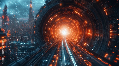 Futuristic tunnel leading to a vibrant city