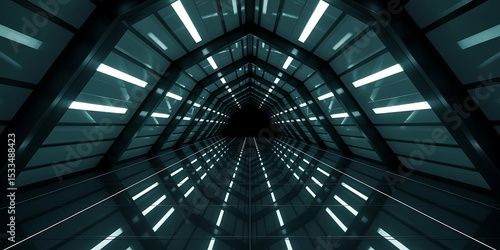 Futuristic Tunnel: Teal Metal, Reflective Floor, Neon Lights - Architectural Design, Sci-Fi Background