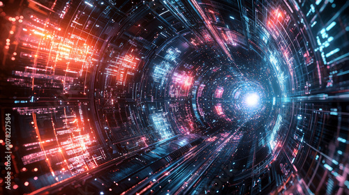 Futuristic tunnel with vibrant neon lights, showcasing mesmerizing space travel scene filled with glowing patterns and dynamic energy