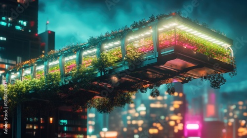 Futuristic urban farming: Innovative elevated hydroponic system in cityscape