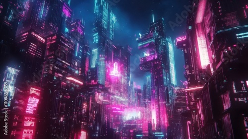 Futuristic Urban Landscape with Neon Lights and Digital Aesthetics
