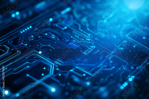 Futuristic vector illustration of a blue circuit board with intricate digital tech elements, perfect for advanced technology backgrounds.