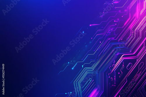 Futuristic vector illustration of an abstract circuit board with neon blue and purple gradients, showcasing intricate digital patterns and tech elements