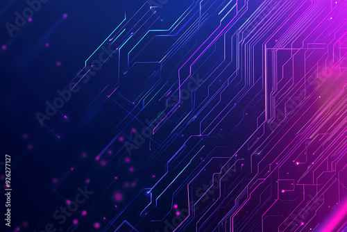 Futuristic vector illustration of an abstract circuit board with neon blue and purple gradients, showcasing intricate digital patterns and tech elements