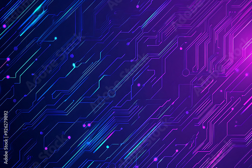 Futuristic vector illustration of an abstract circuit board with neon blue and purple gradients, showcasing intricate digital patterns and tech elements