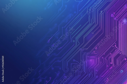 Futuristic vector illustration of an abstract circuit board with neon blue and purple gradients, showcasing intricate digital patterns and tech elements