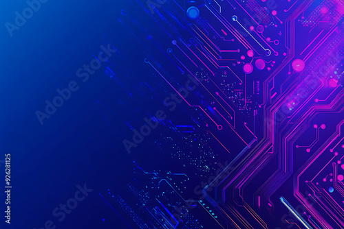 Futuristic vector illustration of an abstract circuit board with neon blue and purple gradients, showcasing intricate digital patterns and tech elements