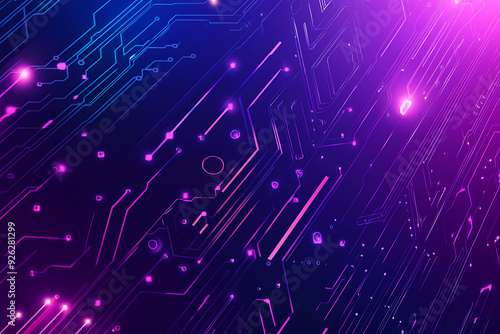 Futuristic vector illustration of an abstract circuit board with neon blue and purple gradients, showcasing intricate digital patterns and tech elements
