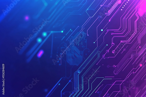 Futuristic vector illustration of an abstract circuit board with neon blue and purple gradients, showcasing intricate digital patterns and tech elements