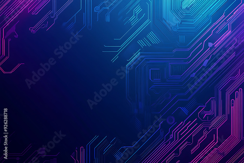 Futuristic vector illustration of an abstract circuit board with neon blue and purple gradients, showcasing intricate digital patterns and tech elements
