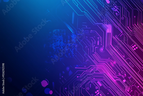 Futuristic vector illustration of an abstract circuit board with neon blue and purple gradients, showcasing intricate digital patterns and tech elements
