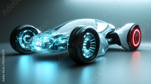 Futuristic vehicle design with transparent surfaces and glowing energy cores