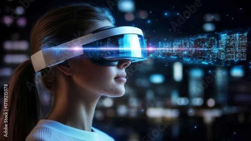 Futuristic Virtual Reality Experience: Young Woman in White Headset Against image features wearing augmented