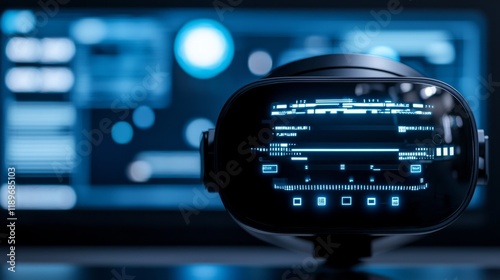 Futuristic Virtual Reality Headset Displaying Complex Digital Interface