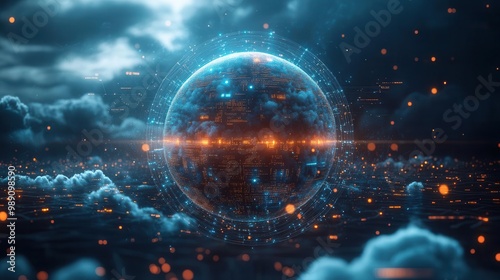 futuristic visualization of cloud computing technology with connected devices floating around a central data sphere linked by glowing network lines against a dark background