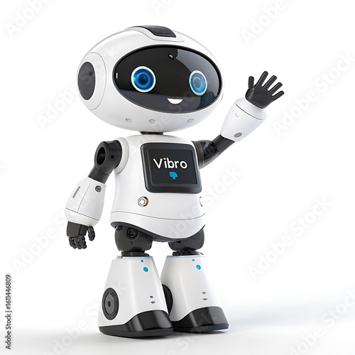 Futuristic White and Black Robot Photo with Blue Eyes and Vibro Display on White Background