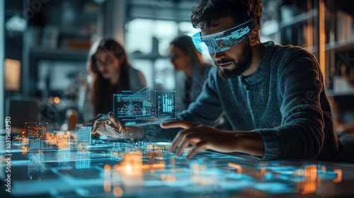 Futuristic Workplace with Interactive Holographic Technology and Digital Interface Display
