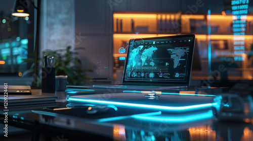 Futuristic workspace with glowing blue digital screens ideal for technology business innovation creative corporate marketing visuals