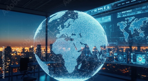 Futuristic World Data Connectivity Digital Globe with Global Analytics and High-Tech Cityscape.
