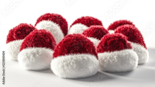 Fuzzy red and white santa hats arranged together on a white background in a festive setting