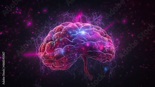 Galaxy shaped as human brain with stars and neurons, purple aura