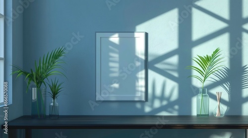 Gallery room interior with drawer table and decorative mockup frame with green plants and play of light