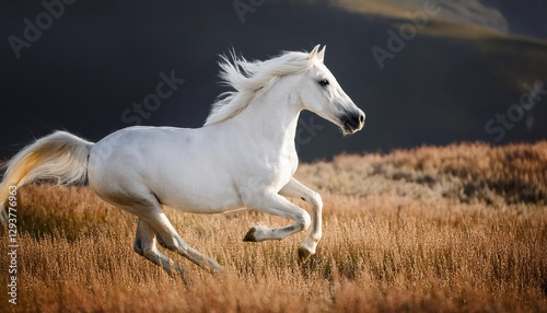 Galloping White Horse against a Striking Sunset Backdrop, Majestic Motion Captured in Vivid Colors and Textures, Perfect for Artwork, Home Decor, or Design Inspiration