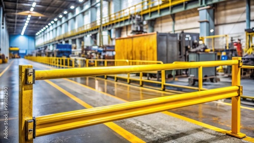 Galvanised yellow metal bar barrier with scratches on industrial machinery background