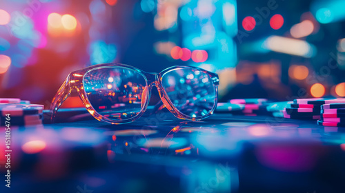 Gambling Concept: Glasses with chips on table, reflecting neon lights, symbolizing luck, chance, and the thrill of winning in a casino night setting.