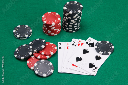 game set of poker cards, for playing big bets, on a green table, surrounded by chips