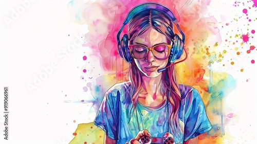 Gamer girl with a gaming-themed t-shirt,Clipart, watercolor illustration, Perfect for nursery art The style is hand drawn, white background