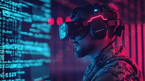 Gamer in virtual reality headset immersed in futuristic digital world