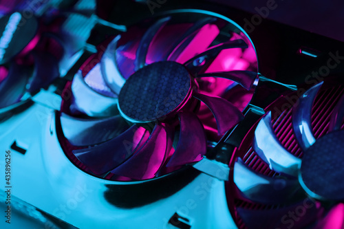Gaming graphics card with neon magenta-cyan illumination and high-speed fans.